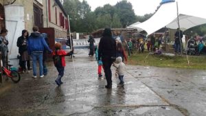 Am nächsten Tag ging es für uns richtig los. Unser Sohn entdeckte schnell die Kinder, die er bereits von seiner freien Schule und von privaten Treffen kannte und tauchte kaum noch bei uns auf. Ich freute mich, viele Leute wiederzusehen, die ich von den unterschiedlichsten Orten auf der Welt kannte. Sich persönlich zu treffen ist doch viel schöner, als nur über das Internet Kontakt zu halten. Leider war das Wetter nicht so toll. Es regnete am Freitag fast den ganzen Tag und war ziemlich kalt. Wir waren alle durchnässt und verfroren. Die Räume unter den Zelten, den Pavillons und im Haus waren gut belegt. Die Kinder dagegen trotzten den Regen und matschten in den Pfützen nach Herzenslust herum.